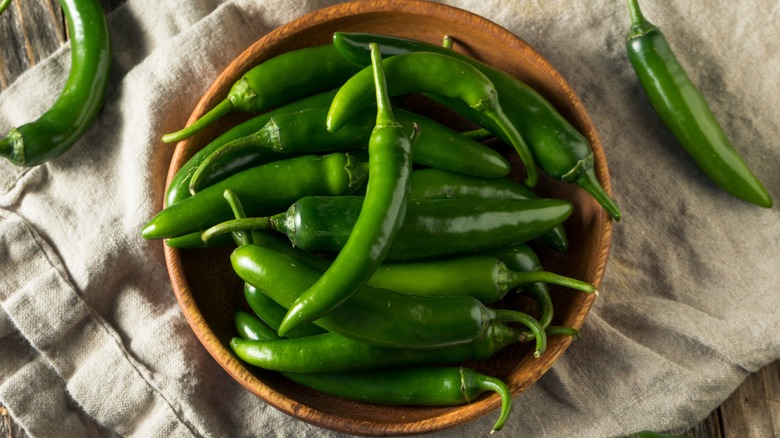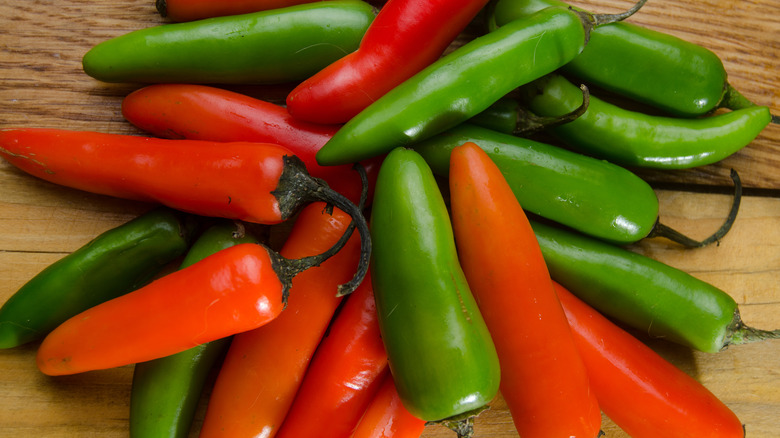 Both of these sweet and grassy peppers are fairly easy to come by in the grocery store or supermarket, and both add a flavorful and fiery bite to your favorite dishes. But when you're ready to whip up a batch of cast iron jalapeño cornbread or embrace a bowl of spicy serrano pico de gallo, it's important to understand the differences between these two related peppers in order to achieve the best results. This will allow you to easily identify them in the store and to know what to expect in terms of heat once you get them home.