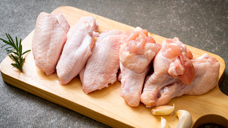 While pickle juice can work wonders for creating a tasty marinade, that's not the only way to season your wings. "Another option would be a dry brine with a flavored salt or kosher salt, and coarse black pepper," explained Stephen Parker. "This dry brine would help the skin dry during the brining process, making it easier to achieve a crispier exterior." Dry brines work with the natural moisture in the chicken, with the salt in them drawing out those juices. Then, over time, they get absorbed back into the meat to create a moist and juicy wing.
