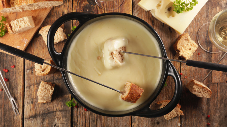 It's no secret that wine and cheese are a match made in heaven, with the creamy, rich flavor of the snack perfectly balancing the tasting notes and alcohol content in your drink. Now, while you can stick to creating classic wine and cheese pairings, another way to enjoy these foods in tandem is to make cheese fondue. Cheese fondue is the best of both worlds — a boozy, creamy sauce, perfect for dipping bread, veggies, and other charcuterie board staples.