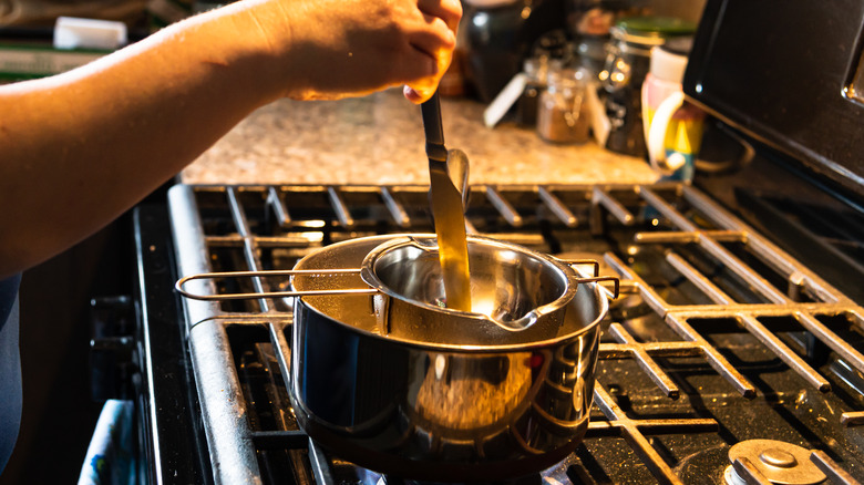 Now, if you're thinking that a bain marie is a lot of work just to warm your fondue back up again and you'd rather pop the cheese in the microwave, there are a few things to keep in mind. For starters, microwaves can alter the texture of your food and give it an unwanted consistency. At the same time, if your fondue gets too hot, it could split or spatter and make a mess in the microwave. If you use the microwave anyway, warm your meal in short bursts, stirring between each session to get it up to temperature and avoid overcooking it.