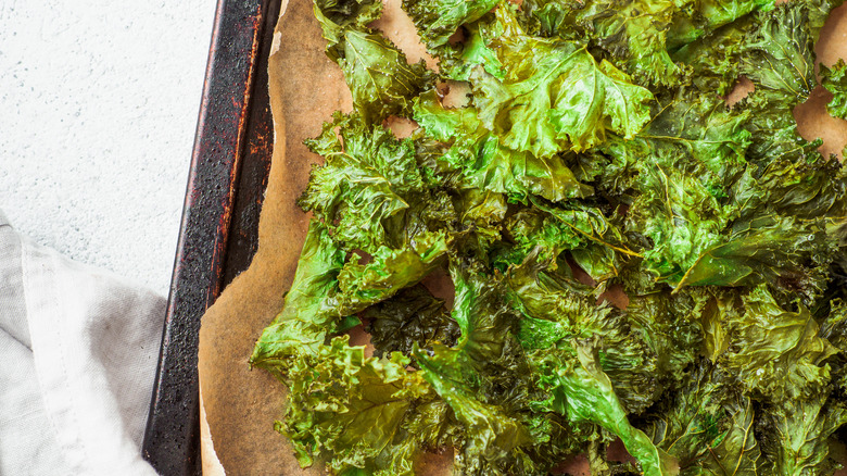 While baking kale chips at a lower temperature helps develop that desirable crispy texture, there are several ways you can elevate the taste and crunch of kale chips even more. One method is to let your kale chips rest a few minutes after you've pulled them from the oven. As they cool, they'll become firmer and crisper, kind of like a tray of freshly baked cookies.