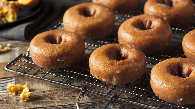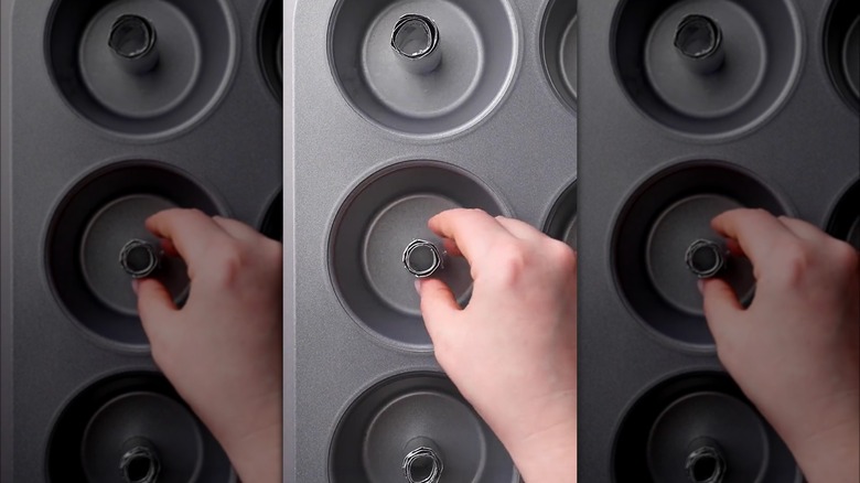 Fortunately, there's a clever workaround for those who want to make cake donuts without buying a specialized pan: Use a muffin tin. Although muffin tins don't have the traditional donut shape, you can easily adapt them by rolling strips of aluminum foil into little tubes and placing them in the center of each muffin cup. Pouring the batter around the foil cylinders you created will then form a hole in the center of each donut, much like a donut pan. This method might result in donuts with a slightly flatter bottom, but it's an effective muffin tin hack that avoids the need for a dedicated donut pan.