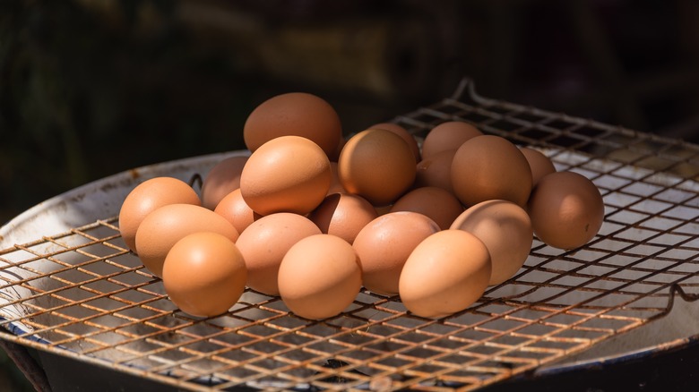 The method for grilling eggs is simple and virtually identical to smoked eggs: Just put the uncracked egg on there, still in its shell. That's the entirety of the process for both preparations, as you don't even need to turn them.