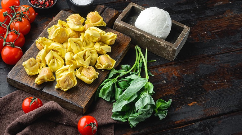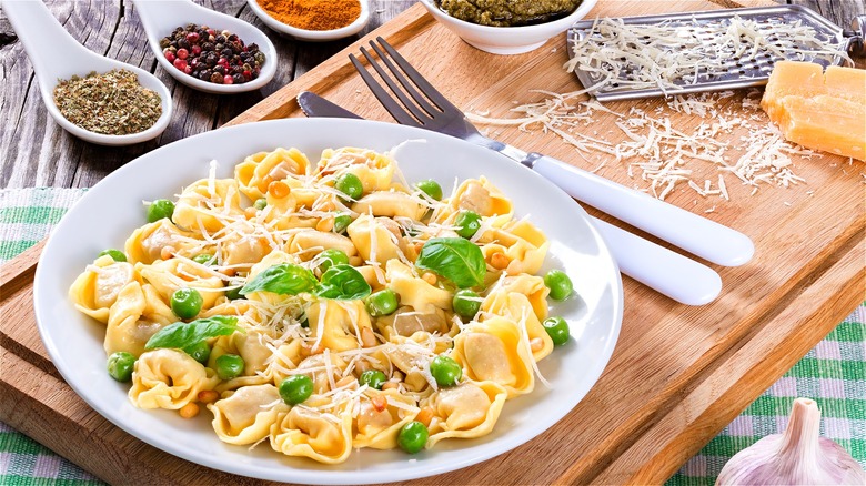 Also, just because you're using cheese-stuffed tortellini doesn't mean you can't add extra cheese to the mix. If you want your pasta salad to be very cheesy, add fresh mini balls of mozzarella or shredded parmesan. For convenience, you can use bottled Italian dressing, or if you have time on your hands, make a dressing with homemade basil pesto. When you're ready to serve, add some freshly chopped basil for an extra pop of flavor, and toasted pine nuts for texture. These additions would also work well with a traditional Italian meat-stuffed tortellini, which uses a blend of ground pork and beef.