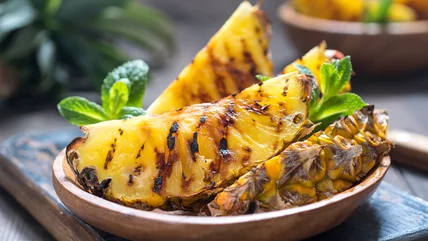 Getting the proper sear on slices can be somewhat challenging, as there's a risk that they may fall through the grates as you flip them to achieve an even doneness. With a whole fruit, you can easily plop the pineapple on the grill without concerns about losing any of the deliciousness to the fires below. Also, a whole grilled fruit ensures that there's enough pineapple to feed a large gathering. This spares you from needing to prepare many individual slices to accommodate all of your loved ones.