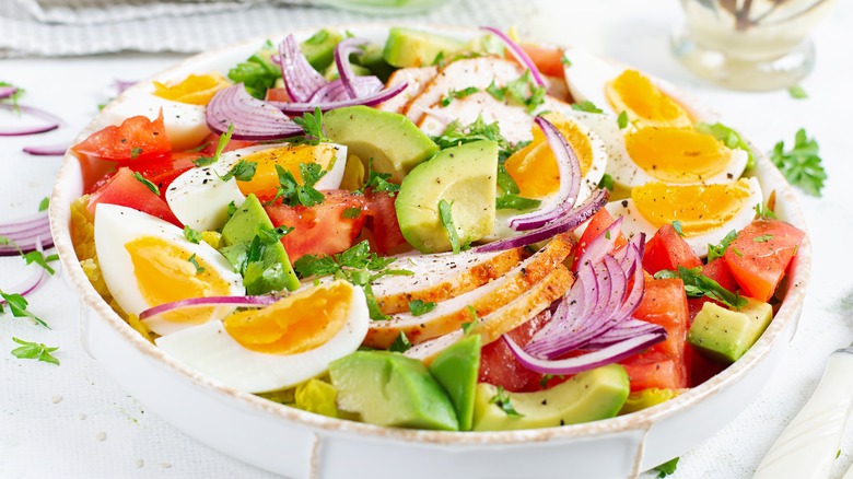 Once you've got your greens in order, it's time to add your toppings. This is where you can really bring out the flavors of your favorite sandwich. A Reuben salad, for instance, might include a dollop of sauerkraut, cubed Swiss cheese, and shaved corned beef. On the other hand, if it's a turkey club you love munching on, you'd be adding bacon, your favorite style of turkey, and tomatoes to the mix. You can even revamp your favorite breakfast sandwiches into a salad — instead of scrambling the eggs, try hard-boiling them to add to the meal, and then complete the dish with your preferred proteins.