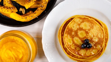 It's not just the flavor of the pancakes that's improved by pumpkin puree; it's the texture, too. With its lush, creamy consistency, pumpkin puree gives each bite of your fluffy breakfast stack a rich, decadent mouthfeel. Delicious and luxurious while simultaneously reducing food waste — what's not to love?