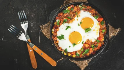 While you might think of refried beans as being served with nachos and tacos, they're definitely not just a dinner food. They pair with eggs just as well as they do with these dinnertime staples: Use refried beans to jazz up basic scrambled eggs, serve alongside some deliciously spicy huevos rancheros, or top a tostada with a dollop of refried beans, a runny fried egg, some salsa, and cheese. They're also pretty brilliant when wrapped inside an omelet or layered inside a breakfast quesadilla with eggs, cheese, and peppers and served with sour cream or guacamole.