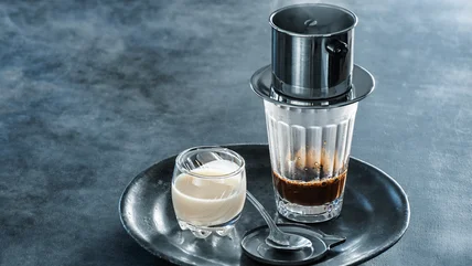 Vietnamese coffee is a delicious cousin of a caffe latte made with sweetened condensed milk — which delivers both dairy and sugar in a single ingredient — and prepared with a phin filter. This contraption is similar to a pour over system, except that it's a slightly slower process and uses less water, making for a stronger, more viscous finished product. This drink is also delicious served with ice as the caffeinated antidote to a hot day.