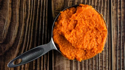 Many ideas often circulate about how to eliminate moisture from pumpkin puree. Common among them are straining with cheesecloth or a mesh sieve, patting with a paper towel, or simply leaving the puree out to air dry a bit. However, using the heat of your stovetop is unrivaled in terms of efficiency and speed. It can take anywhere from about six to 15 minutes over medium heat depending on your particular puree and how much moisture you're hoping to remove. You'll want to stir throughout to avoid scorching but what you're left with is a super-powered pumpkin.