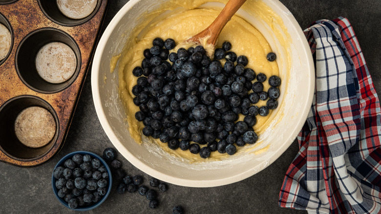 Bursting your blues is a bummer for many reasons. For one thing, you deny yourself and your guests the pleasure of biting into a whole berry and letting it pop in your mouth. But on the more logistical side, it means streaky batter, and blueberries that bleed juices. This adds liquid to your mixture, and the juice can wind up bubbling or burning — and when a ruptured berry is at the bottom, that sticky juice can cement your treats into the tin.