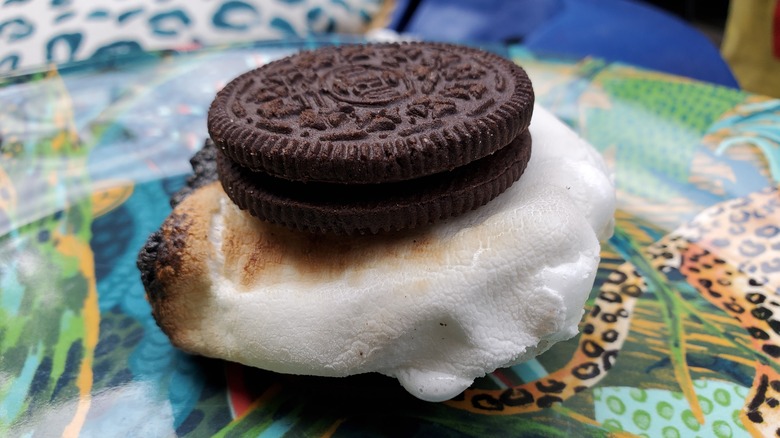 There are few better ways to wrap up a campfire cookout or a backyard barbecue than with classic s'mores. This dessert, which uses chocolate and a roasted marshmallow sandwiched between two graham cracker halves, is beloved. And while "if it ain't broke, don't fix it" is the prevailing philosophy when it comes to this iconic sweet, its simplicity does allow for a little customization. There are plenty of easy additions to amp up your s'mores without treading beyond what is sacrosanct, including swapping out the graham crackers for your favorite cookies.