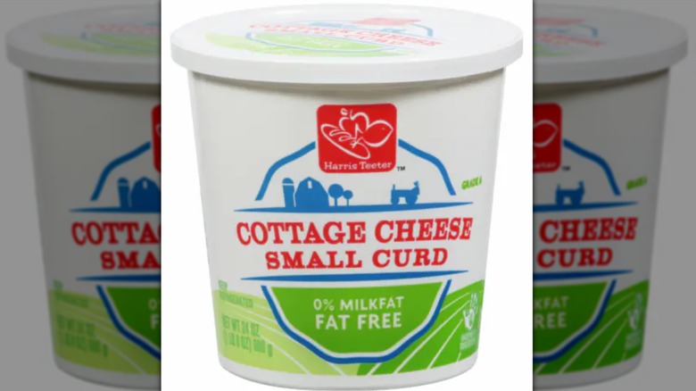 Fat free cottage cheese can seem like a smart choice, especially if you're using it as a mayo substitute in foods like egg salad – and you'd be forgiven for assuming it was. With no fat, a small amount of carbs, and high levels of protein in products like Harris Teeter's Fat Free Small Curd Cottage Cheese, the food can feel like it gives you a lot of nutritional bang for your buck. All that flavor has to come from somewhere, though — and in Harris Teeter's case, its cottage cheese is stuffed with sodium, containing 430 milligrams per serving.