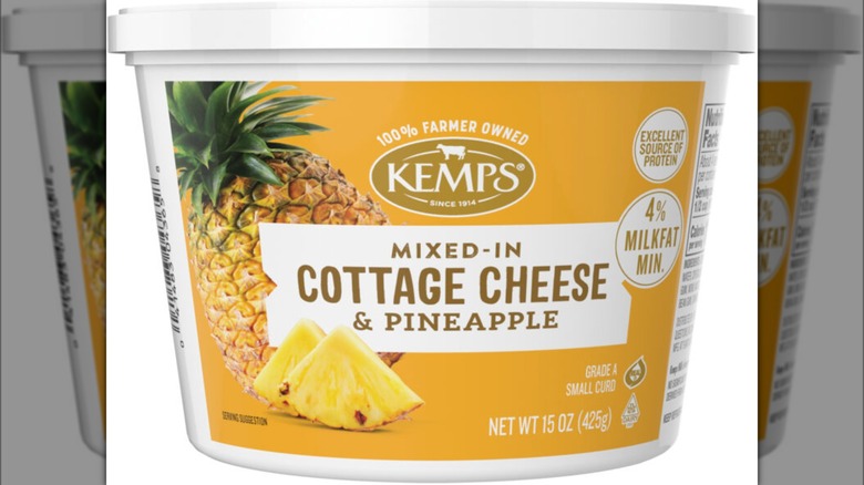 Kemps Cottage Cheese with Pineapple also has a slew of additional ingredients like cornstarch, guar and carbon bean gum, and carrageenan — which, to be honest, we'd rather not see in a pretty simple food product. Although its sugar content is pretty small compared to some other cottage cheeses out there, it's still important to take note of. It's also important to think about how you can cut down on sugar in your diet more generally, by opting for snack options that don't have added sugar and consuming fewer sugary drinks. Getting used to reading nutritional labels can be a crucial first step in controlling added sugar intake.
