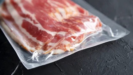 The rolling hack is not only effective but efficient in helping you unpack your bacon by forcing the strips to un-cling from one another and roll with you. This means your individual pieces remain intact, and your slices don't emerge in one big blob. Start by cutting your package open at one end so that air can escape — note that you'll be rolling towards the open end. Then, starting with the closed end, roll your bacon pack up so it forms a yule log of bacon and wrapping and give it a good press to release any tension. After you flatten the roll back out, remove the wrapping and see for yourself how easily the bacon strips pull away from each other!