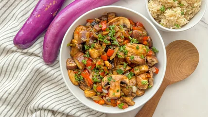 If your weeknights are busy, stir-fries can be your best friend, offering a delicious and healthy meal that comes together quickly. There are many types of eggplant, and in this recipe, we are featuring Chinese eggplant, which has a delicate taste and is inclined to soak up the sauce it's cooked with, making it extra savory and flavorful. Plus, the skin is thinner, so there is no need to peel it — another time saver. To make this meal veggie-packed, we've also included onion, red pepper, mushrooms, garlic, and ginger, and you can easily bulk this meal up with added protein, if desired.
