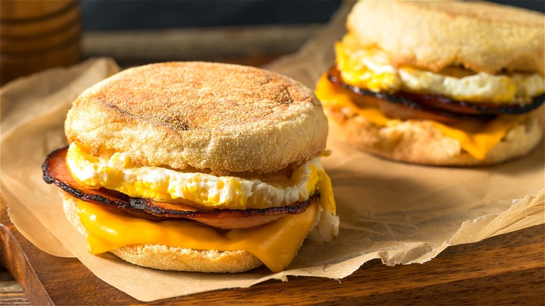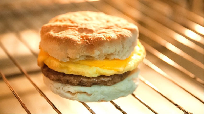 If you want to try a new way of heating altogether, cook Jimmy Dean egg sandwiches in your air fryer. As long as the individual layers are separated, you'll have a perfectly crisp and tender sandwich in less time than if you use your conventional oven. With a few preparation adjustments, you can enjoy both the classic flavors and satisfying consistency of Jimmy Dean's English muffin sandwiches.