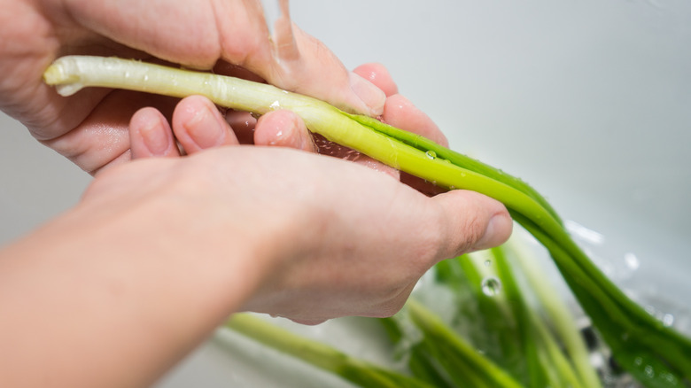 It may be instinct to wash your produce before storing it — especially if you're a fan of those fridge restock videos where each item is washed and placed in an organized container — but washing your green onions is actually a disadvantage. Green onions spoil from too much moisture, so by washing them ahead of time, you overload them with water, which makes them get mushier faster. Instead, wait until just before using them to give them a thorough rinse to make sure they're fresh, crunchy, and ready to use in a recipe or as a tasty garnish.