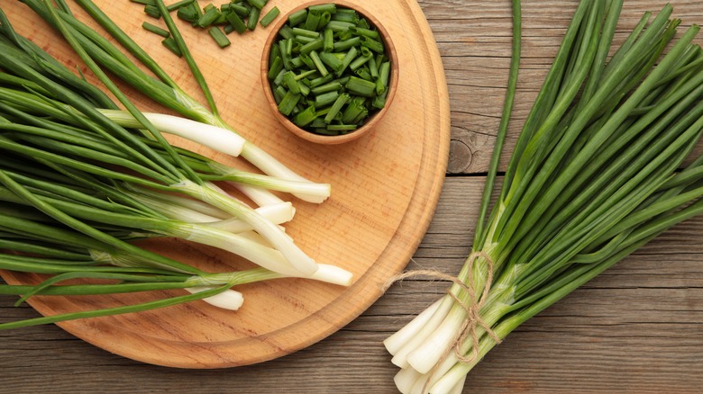 Another popular storage method for green onions is in a glass or mason jar filled with enough water to cover the white part of the scallions. This is meant to keep them fresh and simulate a growing environment, but it can be an impractical way to store them. What often happens is the onions will start to sprout — which, if that's the goal, then job well done — but this doesn't make the onion suitable for cooking and may leave you wondering if it's safe to eat sprouted onions. Additionally, if you leave the scallions in the water for more than a day or two, they can start to wilt just like flowers do in a vase. In essence, this hack is more for show and doesn't do as much to preserve the freshness of your green onions. So next time you pick up green onions from the store, remember to skip the water until it's time to put those veggies to use.