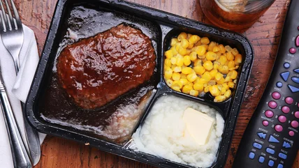 Once Swanson conquered the world with its Original TV Turkey Dinner, it had to start thinking about where it could go next. The answer? Produce more homestyle classics that people would happily consume in front of the television. As such, its Chopped Sirloin Beef meal was born. This frozen dinner was created in 1954, shortly after the Turkey Dinner was released. Like that classic meal, it was packaged in a disposable foil tray with multiple compartments. Alongside your slices of beef, you got a side of golden hashed brown potatoes and individual portions of corn and garden peas, and the whole thing was ready in no time.