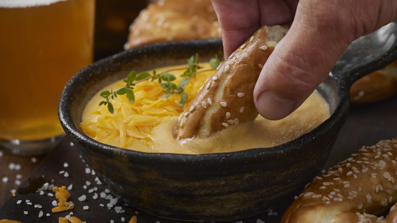 There are other things you should bear in mind when making beer cheese, too — it may be pretty easy to make, but there are still ways to mess it up. Don't skip out on the spices; flavors like garlic powder, smoked paprika, Dijon mustard, and Worcestershire sauce are what separate a great beer cheese from a plain, boring one. Maybe counterintuitively, drinking beer alongside beer cheese isn't the best idea as the flavors can get muddy — wine can be a much better option. And if you really don't want to use alcohol because your guests don't want to consume it or for whatever other reason, non-alcoholic beer can work fine for beer cheese, too.