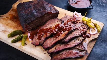 A few things that happen when you allow a brisket to age instead of smoking it when it's fresh from the store. Brisket comes from an area of the cow that's worked a lot, and here's a fun fact: The word "brisket" actually refers to the part of the cow the cut comes from, which is the lower chest — or "breast" — area. Because it's exercised as the cow walks, it's a fatty piece of meat that has a lot of connective tissue, or collagen. Cooking it low and slow is one way to get that tough tissue to break down into a tender piece of meat, and aging it also helps the tenderizing process. As meat is left to age, there's a chemical process that goes on inside the meat. Enzymes break down protein structure, and those proteins are what hold that tough connective tissue in place.