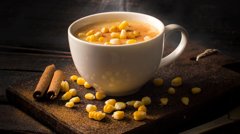 There are several ways that you might find corn juice prepared, including the straightforward method of boiling sweetcorn kernels with some sugar, then cooling and blending before chilling and serving. There's also corn milk, which comes from the cob instead of the kernels and is the unexpected addition your coffee needs — and is often used as an ingredient in soups and sauces as well as in drinks.