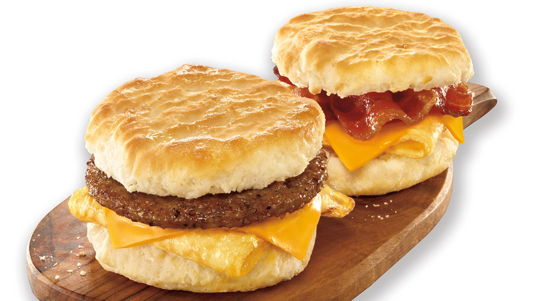 In 1982, KFC filled a biscuit with something more familiar — chicken. The simply named Chicken-in-a-Biscuit was advertised to customers with the tagline, "You just can't resist it!" Apparently they could, as it didn't last much longer on menus. Two years later, some locations offered up Creamed Chicken in a Biscuit, which had creamed chicken, peas, and carrots sitting on top of a buttermilk biscuit. In 2019, the Biscuit Slider was introduced abroad. While breakfast is no longer an option at nationwide KFC's, it is served at a few airport locations. If you happen to catch an early flight out of LAX, there are several biscuit sandwiches available, including a classic bacon, egg, and cheese biscuit.