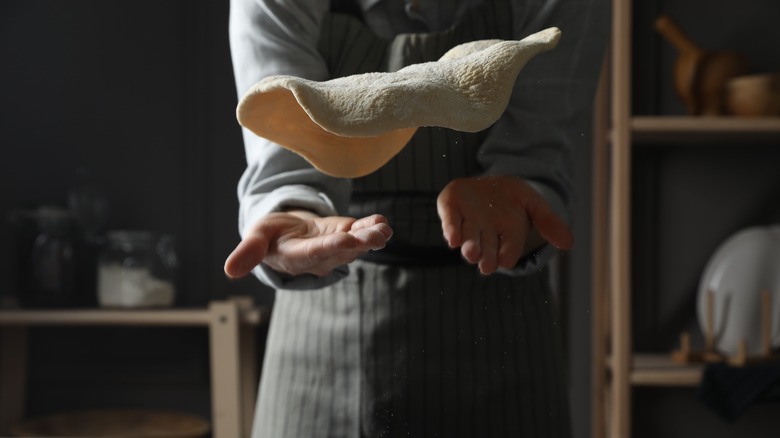 Shaping your pizzas by pushing them down, instead of throwing them in the air, has a lower degree of risk — but it also changes your eating experience. Hand-tossing pizza stretches the dough more gently and stops it from being too overworked, which can occur when you're pushing it down and working it too hard. Stretching the dough on a flat surface also increases the risk of tearing it, and can also dry it out. Additionally, overworking your pizza on a flat surface can toughen it up, resulting in a chewier experience (which can border on unpleasant). Pizza Hut doesn't always hand-toss its pizza, even today, its Pan Pizza is shaped directly in the tray, but those who like a lighter crust will be pleased that they're not eating in the olden days.