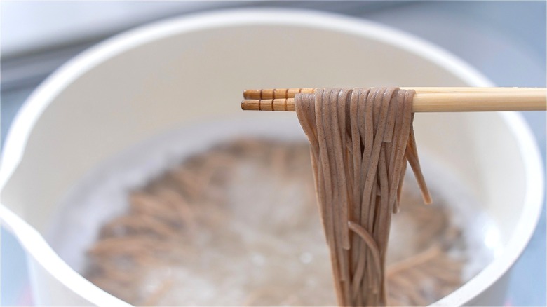 To achieve the right bite, Chen advises cooking your noodles until slightly tender. According to the food blogger, "Soba cooks quickly compared to pasta, so keep a close eye on it." An important factor to consider is that each brand of fresh or pre-packaged soba noodles is made from varying amounts of buckwheat flour, which affects cooking time. To avoid overcooking soba noodles, Chen says to follow the directions listed on each package. Moreover, the blogger claims fresh soba noodles only take a few minutes to cook, whereas dry packaged varieties need four to five minutes, depending on the brand.