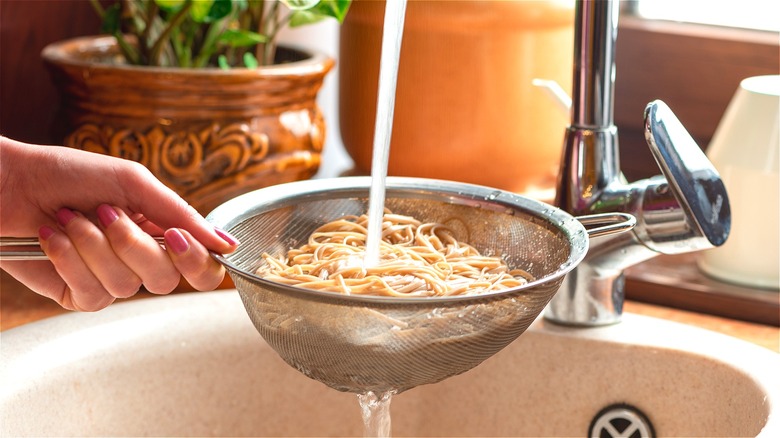 When you're ready to take soba noodles off the heat, Namiko Hirasawa Chen recommends dousing soba noodles with cold water after draining. Chen claims, "Rinsing removes the excess starch, keeps the soba from sticking together, and stops the cooking." Furthermore, you may want to move the noodles around with your hands to help the process along. If you're planning to serve freshly prepared soba noodles in a bowl of hot soup, transfer them to the broth right away. The longer cooked soba noodles stay in your colander without water, the higher the chance of them clumping together.