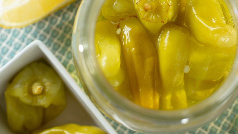 First, what is a pepperoncini, precisely, and what kind of flavors is the brine going to bring to a dirty martini? Although they look similar to banana peppers, they're not the same thing. Pepperoncini are small chili peppers that are commonly used as an ingredient in Mediterranean cooking, and their sweet and only slightly spicy flavor makes them incredibly versatile. If you know someone who hesitates at the idea of spicy heat, this is a perfect pepper for them. They're one of the mildest chilis out there, and that means that adding their brine to a martini will bring a tiny tingle of heat instead of a spicy, overpowering kick.