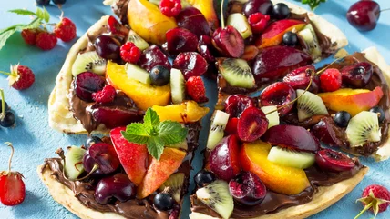 Because it's a quintessential summer dessert, consider building a fruit pizza with summer seasonal produce. A coconut cream sauce gives the pizza a tropical-tasting base that's bolstered by the oceanside essence of juicy mangoes, the nectarous appeal of peaches, and the tangy sting of diced pineapple. When drizzled with a swirl of floral agave nectar and a delicate squeeze of lemon or lime juice, you're left with the perfect summer-shaded fruit pizza.