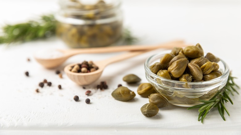 Adding capers to store-bought pesto is super simple, too. Just fish a few out of the jar, chop them up, and pop them into the sauce, mixing them through and allowing them to sit for a while. You can use any type of caper you choose — and if you want to give your pesto a little more texture, mix some nonpareil capers in without slicing them at all. They're small enough to be added without preparation, and when you bite into them, they'll burst with a juicy acidity.