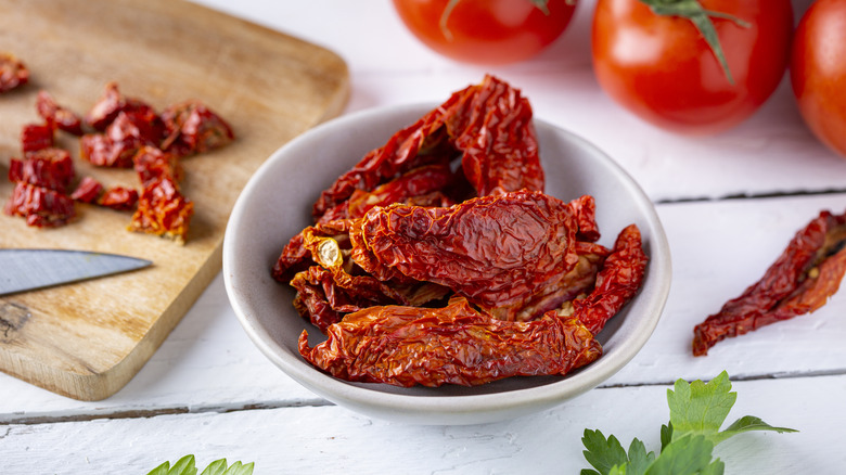 However, you don't have to make sun-dried tomatoes the primary flavor of your pesto. If you have a standard store-bought jar, simply chop up some sun-dried tomatoes and stir them in (before removing some of the pesto first — some of these jars can be full to the brim, making mixing in new ingredients tricky). The tomatoes will immediately start to imbue the pesto with flavor and will pair excellently with the herby basil notes. While you can use your pesto straight away, it's best to leave the newly-mixed sauce for a while, to allow the tomato flavor to incorporate properly. If you find it's too chunky after adding the tomatoes, smooth it out with some extra olive oil.