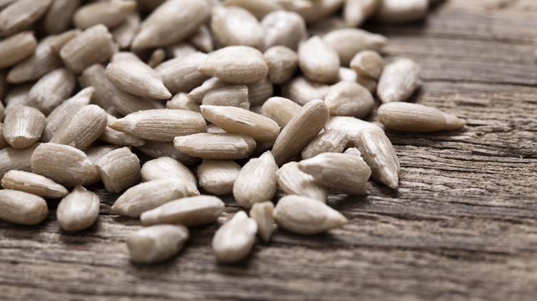 Pestos normally have a type of nut in them, with pine nuts being the most common in a classic pesto. However, when they're store-bought, they can lose their crunch. As the pesto sits, the morsels of nuts soften, turning from pleasingly crunchy to sort of gloopy and redundant. If you're missing that crisp factor, one of the quickest ways to add it back in without spending your evening grinding your own nuts is with sunflower seeds. These seeds are the ideal ingredient for a nut-free pesto, but you can use them in a nut-based one too. They're small enough to mix through it easily, and large enough to get your teeth around — and their nutty, woody taste helps deepen the sauce's flavor.