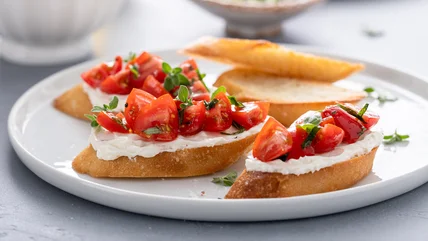 You can also add ingredients like parmesan cheese or goat's cheese, along with thyme or rosemary, into the mix if you want to customize your cream cheese and add several different flavor notes that range from sweet to savory to herby. Consider caramelizing some onions and adding them to your cream cheese for a caramelized onion dip-like spread before you smear it onto your bite-size toasted bread. This combo, along with some basil ribbons, creates a base that craves chopped tomatoes and garlic to top it off. You can even make it in advance if you want.