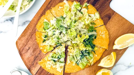 As such a novel take on a pizza dough base, The chicken crust is the real feature here. While Caesar salad is an obvious topping, Vergara notes that you can let your imagination run wild with the salad variations. She says, "I like this with a Greek salad or even a Cobb!" If you're a fan of tangy and briny flavors, a Greek salad is a winner. If you want to further boost the protein content and layer on the flavors, Cobb should be your go-to. A mixed leafy green salad or spinach leaves tossed with a balsamic dressing would also make a nice pairing.