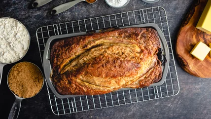 This banana bread's texture might be slightly different from a classic loaf's consistency in that it has a lighter, cake-like taste to it. That said, if you are short on time and ingredients, it is a great option. Not to mention, you can customize this three-ingredient recipe with some of your favorite add-ins. Add some chocolate chips or chocolate pieces and the kids will love this easy chocolate chip banana bread. Walnuts, pecans, and sunflower seeds are also among some of the best go-to options. You can add these ingredients to your mix so you get a little bit throughout each slice, and then reserve a handful of your add-in of choice and top the loaf with it before you pop it in the oven to bake.