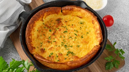 Transforming this dish from sweet to savory results in a true makeover for your mouth. Without the sweetener, a Dutch baby has more of an eggy taste and instead is more reminiscent of a Yorkshire pudding which uses meaty drippings to give it a rich, savory bite. To create your masterpiece, when you mix up the batter in your blender you can add herbs like thyme, basil, or oregano directly to it to give it an herby vibe along with some shredded cheese like parmesan or pecorino.