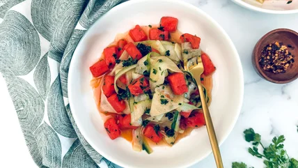 Take a break from leafy green salads with this cucumber ribbon and watermelon dish, which coats the summer produce in a soy sauce–based dressing.