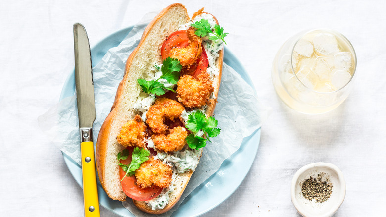 At the same time, this method means that you don't have to worry about how many veggies you add. While lettuce and tomato are staples, you can also add Wallace's suggested pickles and onions. Or you can upgrade your shrimp po' boy with additional ingredients. For instance, a sweet pineapple slaw can not only add unique tasting notes to your sandwich but can also serve as an extra glue to help hold the other veggies inside. Or, perhaps you'll finish it up by piling in gooey, melted cheese to lock the ingredients in place. Either way, by following Chef Wallace's suggested order, you can easily keep your sandwich from falling apart.