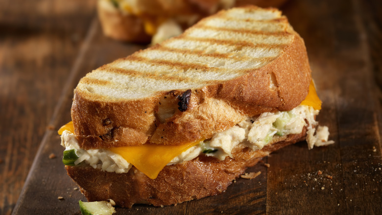 In its most basic form, a tuna melt consists of creamy tuna salad along with a slice of cheese, flanked by two slices of bread which have been buttered and readied for your griddle. Fry it up like a grilled cheese sandwich and you have a delicious and hearty meal. When whipping up tuna melts for a crowd, you can make a batch of sheet pan tuna melts to make things easier. They are convenient without sacrificing taste; however, if you're looking for a delicious way to upgrade your tuna melt into a Southern-inspired delight, try adding some tangy pimento cheese.