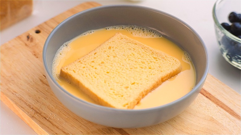 "When the bread isn't egged (just heavily mayo'd), I like sourdough to add a bit more structure to the thing," Halley says. Since mayonnaise has a higher smoke point than butter, this easily spreadable condiment gives your grilled cheese a golden brown crust and delectable texture. Grilled cheese sandwiches made with sourdough bread are not only sturdy, but have an extra tanginess from sourdough's fermented origins. Now, if you're looking to make an ultra-savory grilled cheese that requires a few extra steps, Halley has an alternative option that requires fluffy white bread, and you guessed it, raw eggs.