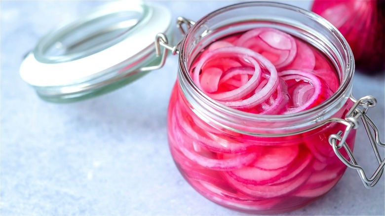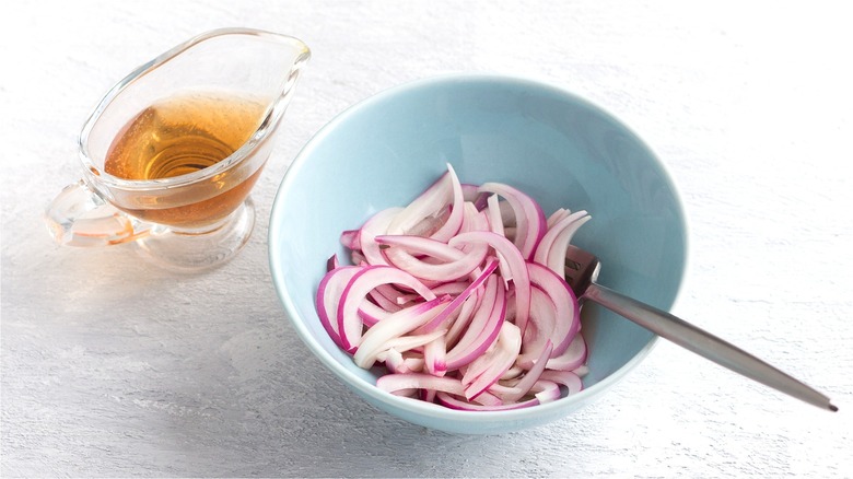 If you enjoy adding flavor-packed ingredients to everyday meals, consider making your own pickled red onions. Given the fact that these bright pink delights are made simply by combining sliced red onions, salt, sugar, and your favorite vinegar, why wouldn't you have a ready-made jar handy at all times? Pickled red onions are a zesty ingredient to use when your meals and snacks need an extra jolt of flavor. Not only do these easily prepared pickled onions add a satisfying crunch to food, they also have a briny taste that balances rich and savory dishes. While most pickled red onion recipes seem pretty straight forward, there is one type of vinegar you should use when you want a sweeter result: Apple cider vinegar.