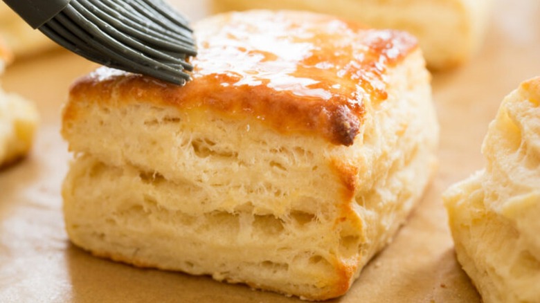 In our opinion, you can't make biscuits without butter (well, you can, but unless you're vegan or need to avoid butter for dietary purposes, we wouldn't recommend it — it just won't taste as good). When you add your butter, though, can make a huge difference. Naturally, you'll need to add the main bulk of your butter to your dough, kneading it into the flour while it's still cold. Melting the rest of your butter and brushing it on top of your baked biscuits can give them an extra kick of flavor, but adding it beforehand is a big no-no.