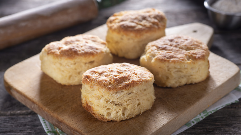 "I would recommend topping them with butter after baking if you want that extra bit of butter flavor on top," Hannah McClain says. "If you butter before you bake, you risk burning the butter." This is a mistake that all too many home chefs make, to their biscuits' detriment. Butter's high concentration of milk solids makes it especially prone to burning, and while this is more likely to happen when it's exposed to contact heat (like in a pan), it can still happen in the oven — it's why butter isn't quite the egg wash substitute you think it is. Protect your biscuits, and dab them with butter once they're almost on the table.