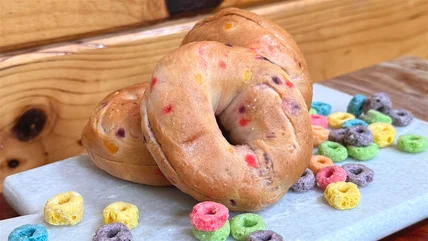Did you ever think about combining bagels and cereal? No, neither did I. While I did go through a phase of crushing up Doritos Cool Ranch chips and putting them on bagels with cream cheese (was this a regional thing?), I've never thought about a sweet and savory combo like this. I've used Froot Loops for baking projects like a Rice Krispies treat swap, but that's where my creative food combos come to an end.
