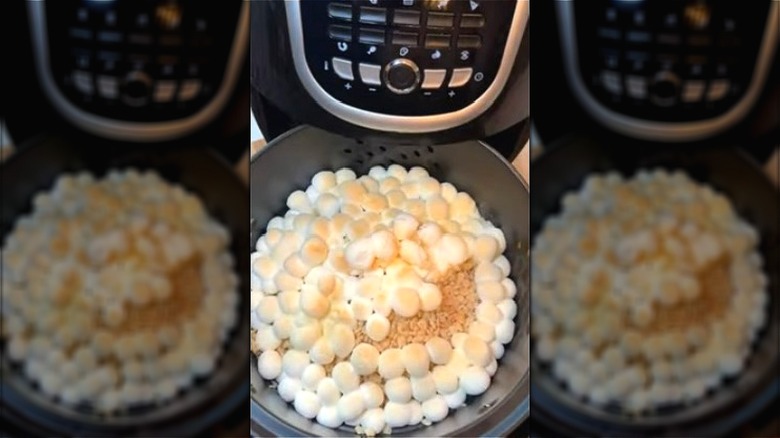 It's not a question of whether this device can handle sweets. You can make fried ice cream in your air fryer as well as delicious cookies and donuts. Nonetheless, using this appliance to craft Rice Krispies treats comes with some potential downsides. As seen in the TikTok video below, during preparation, the air fryer basket is loaded to the brim ingredients. It starts with the cereal (which you don't want blowing around) followed by marshmallows and pats of butter.