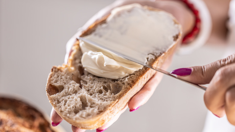 Low-fat sandwich spreads can feel too good to be true: All the buttery goodness of a regular margarine or butter, but without all the fat. Unfortunately, these sandwich spreads are often highly processed, and whether they're low-fat or not, they're generally not that good for you. Margarines and other sandwich spreads tend to be made up of a range of oils, added colors and flavors, stabilizers, and extra additives — none of which exactly scream health. Although it's true that low-fat sandwich spreads may have less oil than the full-fat versions, they may also achieve a better texture through additional ingredients, like fillers or protein isolates.